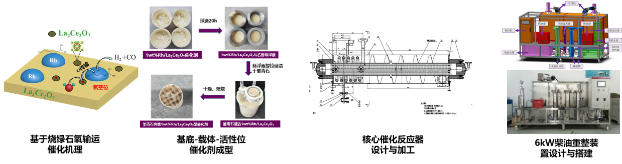 合成開發(fā)了基底-載體-活性位成型的液體碳?xì)淙剂洗呋瘎?,柴油重整轉(zhuǎn)化率大于98%,產(chǎn)物中關(guān)鍵雜質(zhì)含量低于國際同類文獻(xiàn);突破了催化劑、反應(yīng)器、系統(tǒng)集成等關(guān)鍵技術(shù),開發(fā)了以甲醇、天然氣、柴油等燃料重整制氫樣機(jī):35Nm3/h制氫量甲醇重整制氫系統(tǒng),產(chǎn)品氫氣雜質(zhì)CO<0.1ppm、H2S<0.00001ppm;柴油重整轉(zhuǎn)化率大于98%、柴油制氫熱電聯(lián)供效率達(dá)82.3%,產(chǎn)物中關(guān)鍵雜質(zhì)含量低于國際同類文獻(xiàn),完成柴油重整制氫樣機(jī)在四川康定4200米高海拔、福建平潭島高鹽高濕的特殊環(huán)境運(yùn)行。正式發(fā)布了關(guān)于柴油重整標(biāo)準(zhǔn)1項(xiàng)。